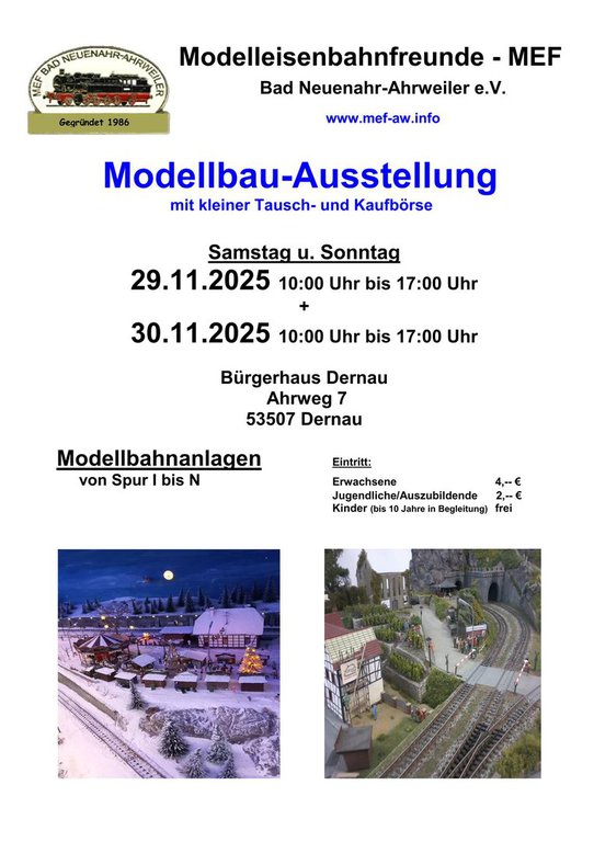 Am Samstag, 29.11.2025 und Sonntag, 30.11.2025, eröffnet die jährliche Modelleisenbahn-Ausstellung der Modelleisenbahnfreunde Bad Neuenahr-Ahrweiler e.V. (MEF) und lädt alle Interessierten ein, in die faszinierende Welt der Miniatur-Eisenbahnen einzutauchen.