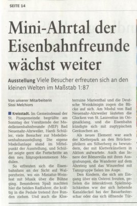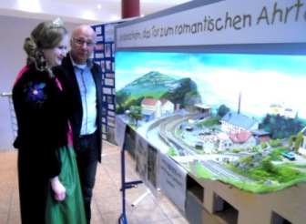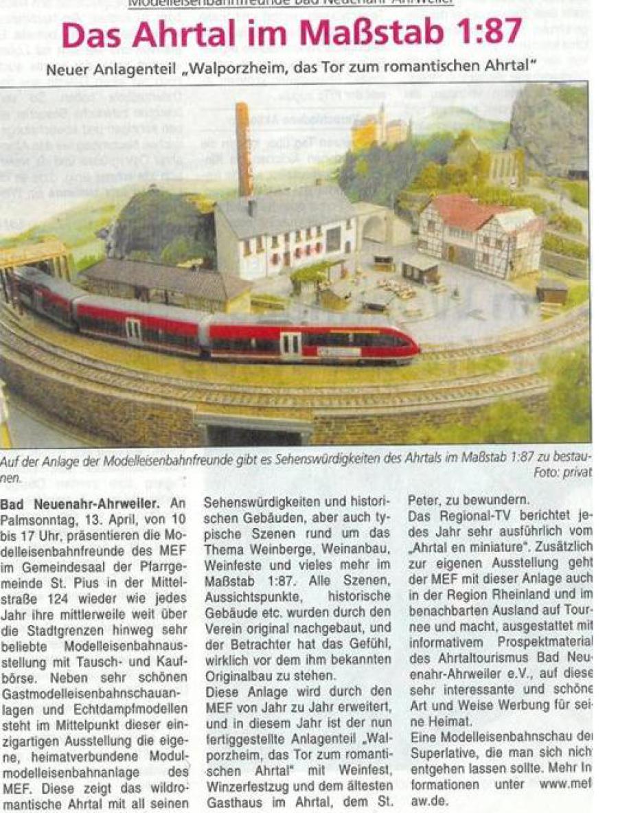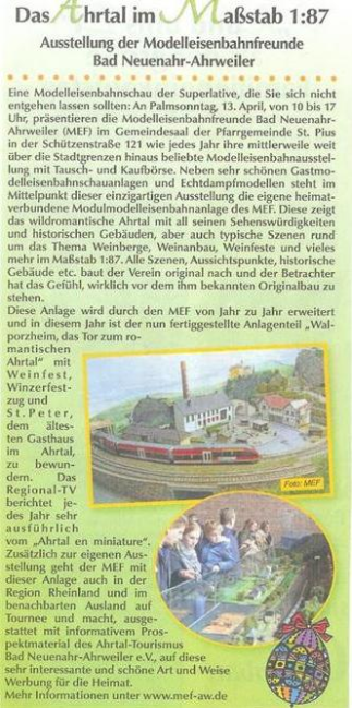 Pünktlich zur Piusausstellung des MEF an Palmsonntag war der 3. Bauabschnitt der Modulanlage 'Bad Neuenahr-Ahrweiler und das Ahrtal en miniature' fertig gestellt. Eine besondere Freude bereitete die amtierende Walporzheimer Weinkönigin, Viktoria Kugel in Begleitung des Walporzheimer Ortsvorstehers Gregor Sebastian dem MEF. Die amtierende Weinmajestaet gab den 'Startschuss' für die öffentliche Präsentation des neuen Modulteils und weihte ihr Miniaturwalporzheim 'Walporzheim, das Tor zum romantischen Ahrtal' offiziell ein, das Szenen rund um den Weinort Walporzheim und Marienthal zeigt.
