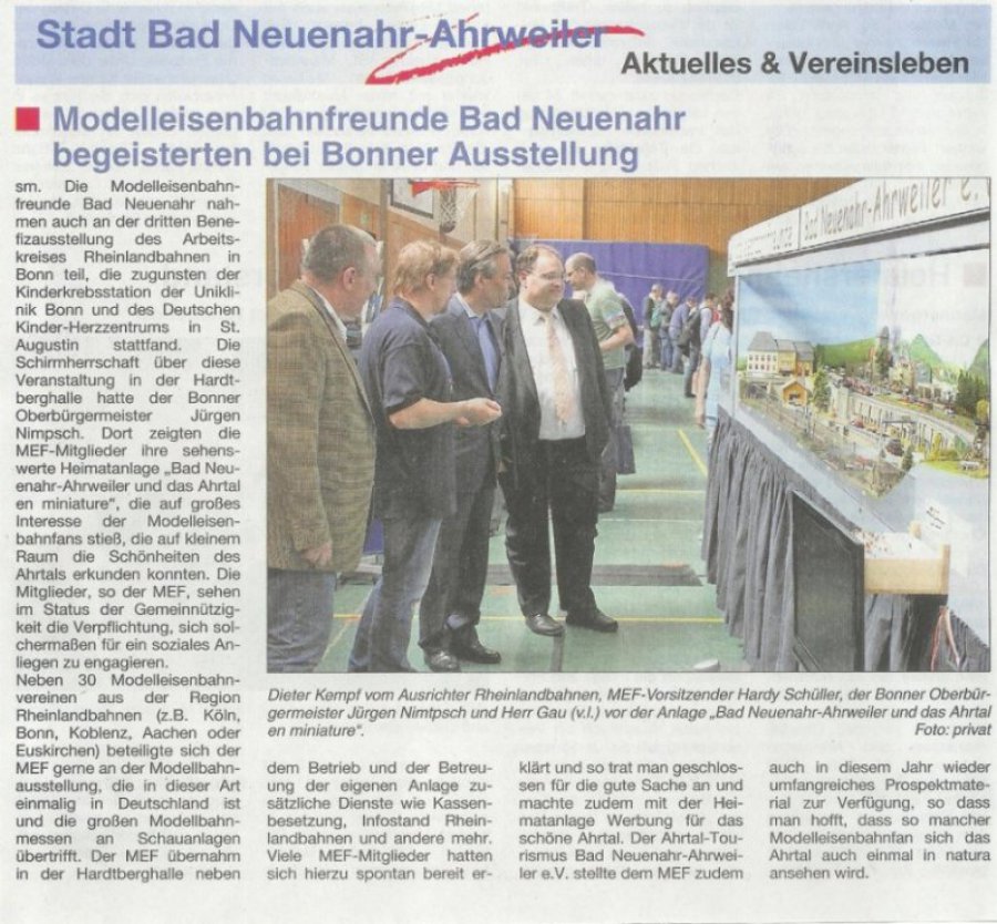 Auf dem Bild sind der Bonner Oberbürgermeister Nimtpsch uind Vorsitzender Rheinlandbahnen Kempf im Gespräch mit Hardi Schüller, 1. Vorsitzende MEF, vor der Anlage 'Bad Neuenahr-Ahrweiler und das Ahrtal en Miniatur' zu sehen.